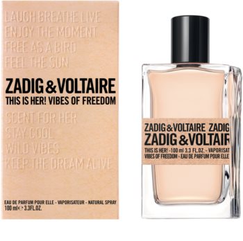 Zadig & Voltaire This is Her! Vibes of Freedom is een parfum voor dames van Zadig&Voltaire, gecreëerd door Sidonie Lancesseur, is een fris en bloemig shot positiviteit vol goede vibes! Een frisse vleug vrijheid met pioenroos en sprankelende peer. Stralende jasmijn en moderne roos. Verleidelijke noten van kastanjecrème.
